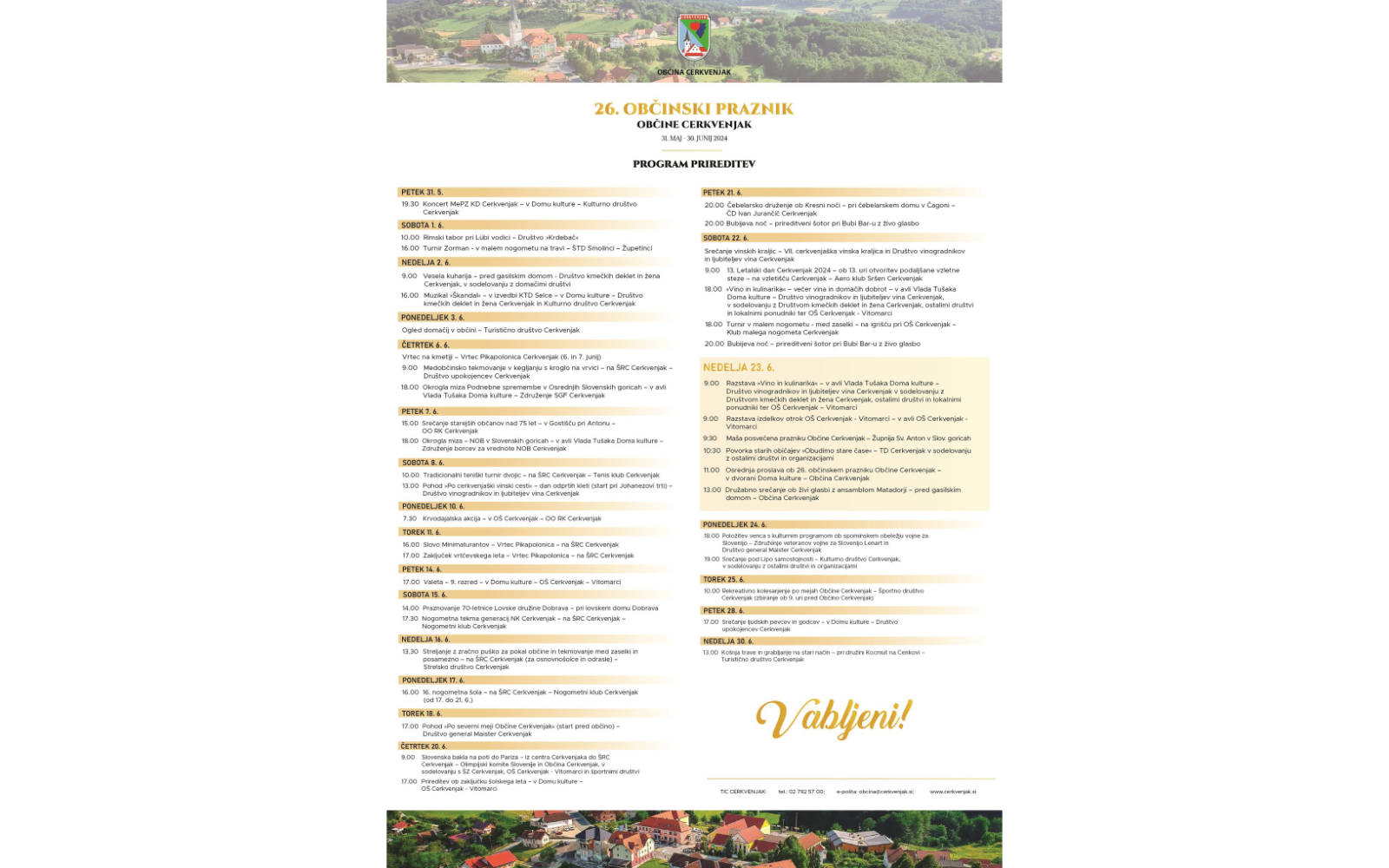 Osrednja proslava ob 26. občinskem prazniku Občine cerkvenjak bo v dvorani kulturnega doma potekala v nedeljo, 23. junija, s pričetkom ob 11. uri. Na ta dan bosta od 9. ure zjutraj na ogled postavljeni kar dve razstavi: prva v kulturnem domu z naslovom Vino in kulinarika ter druga v šolski avli z izdelki otrok OŠ Cerkvenjak-Vitomarci. Prav tako bo že pred osrednjo proslavo potekala tradicionalna povorka starih običajev, ki jo tudi letos pripravlja TD Cerkvenjak v sodelovanju z ostalimi društvi in organizacijami. Ob 13. uri pa za zaključek osrednje nedelje sledi še družabno srečanje ob živi glasbi z ansamblom Matadorji.