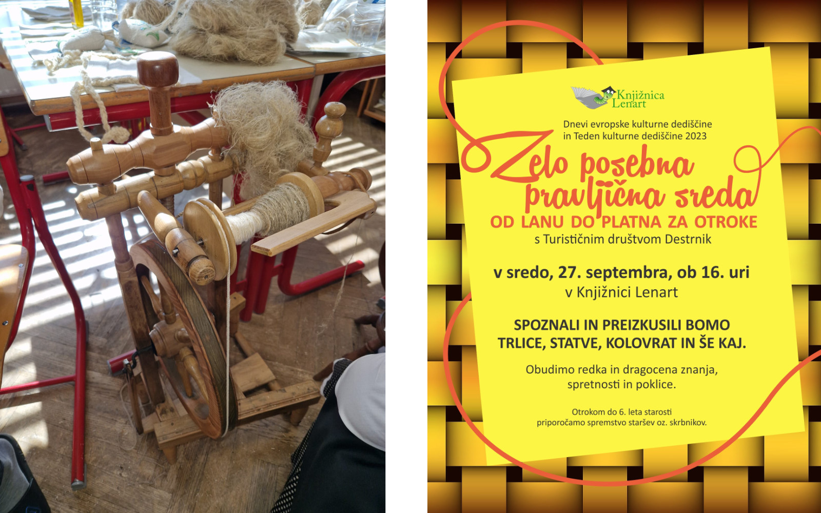 Člani Turističnega društva Destrnik, ki so se domislili projekta Od lanu do platna ter ga že več let uspešno izvajajo, se nam bodo pridružili v Knjižnici Lenart. V prostorih knjižnice bodo pripravili razstavo na to temo, v večnamenski dvorani knjižnice pa izvedli delavnico, ki bo v prvi vrsti namenjena otrokom.