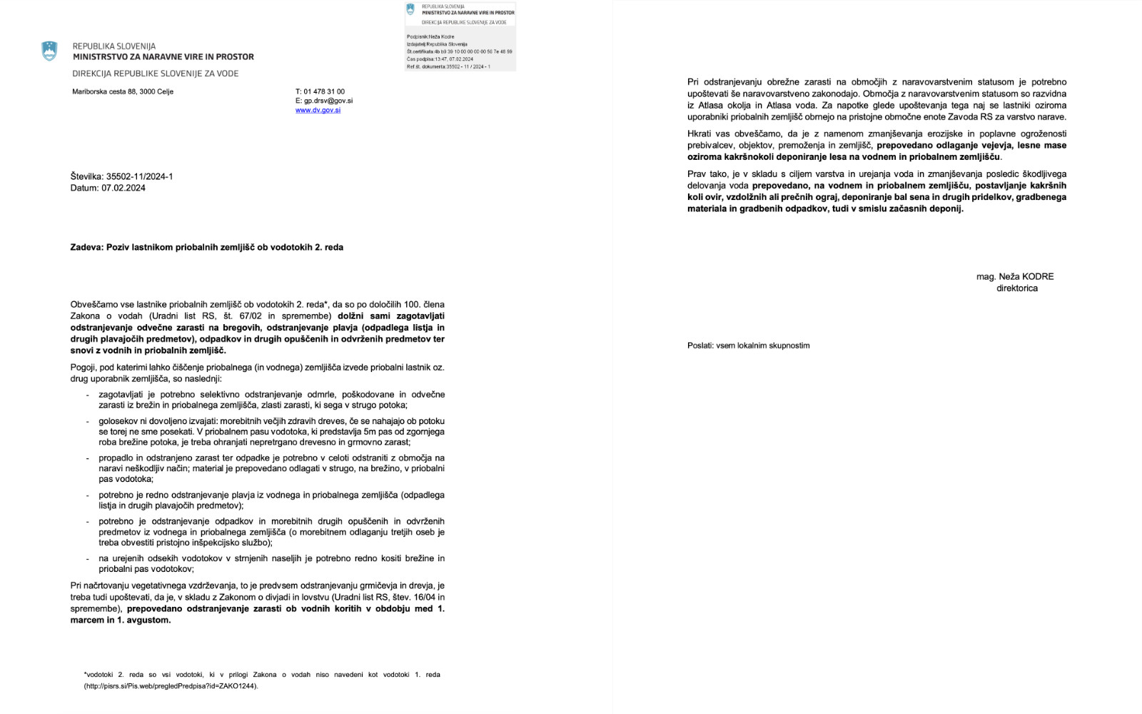 Obrežne lesne vegetacije pa ni potrebno imeti na obeh bregovih vodotokov. Dovolj je, če ta poteka izmenično vzdolž celotnega vodotoka. To lastnikom priobalnih zemljišč vodotokov odreja tudi Direkcija RS za vode.