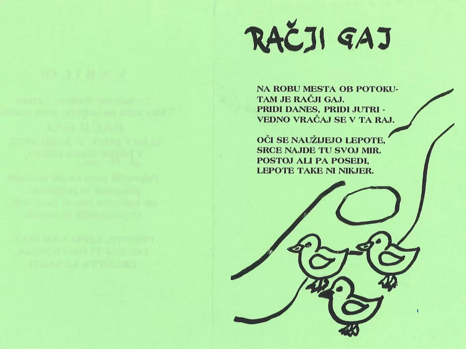 Nekdanja članica Turističnega društva Lenart ga. Lojzka Zemljič, je ob otvoritvi pred 20 leti podelila pesem, posvečeno Račjemu gaju: