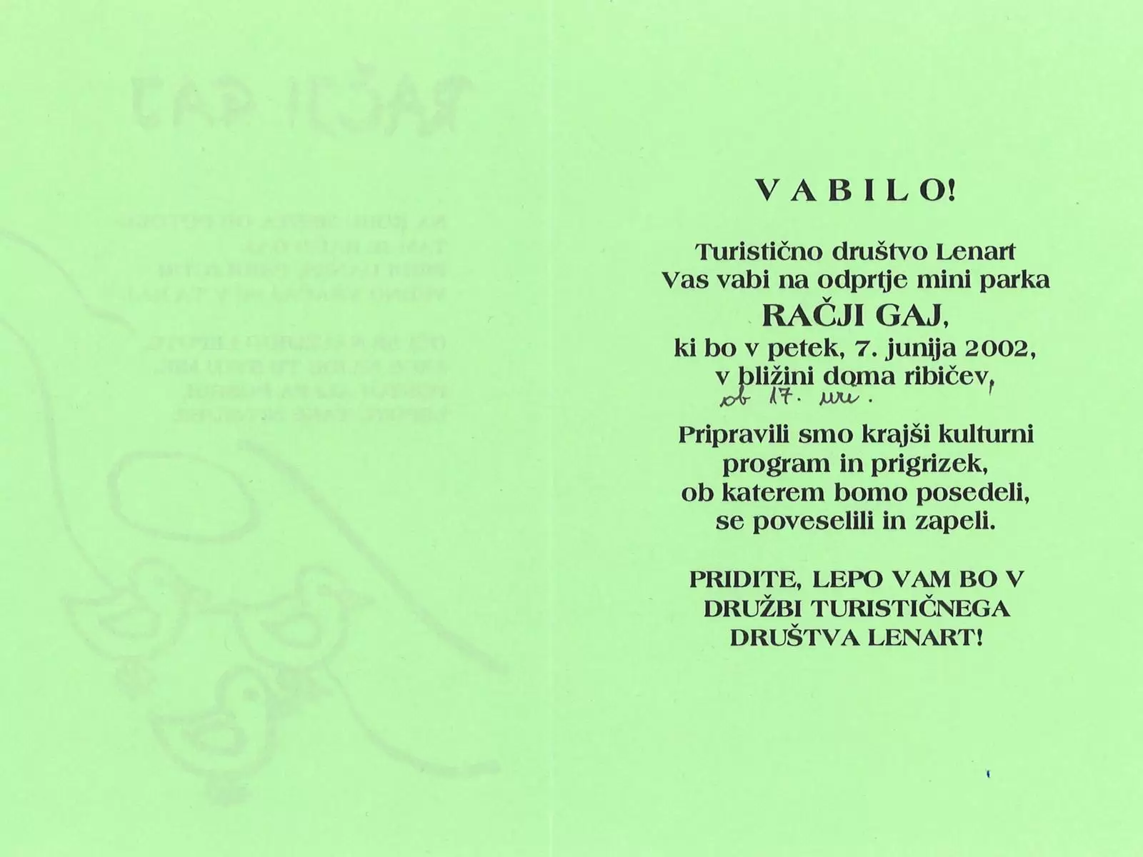 Objavljamo fotogalerijo iz otvoritve Račjega gaja, 7. junija 2002, ki ga hrani Tatjana Kraner: