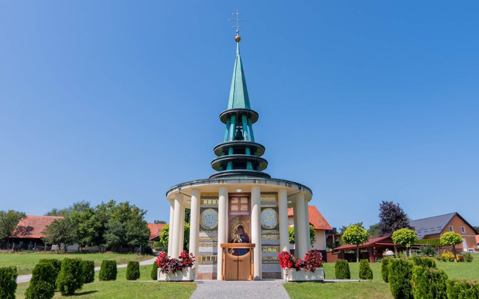 Poleg mozaika v apsidi kapele, je nov tudi mozaik Marijinega monograma (»mariogram«) ter Kristusovega monograma (»kristogram«)