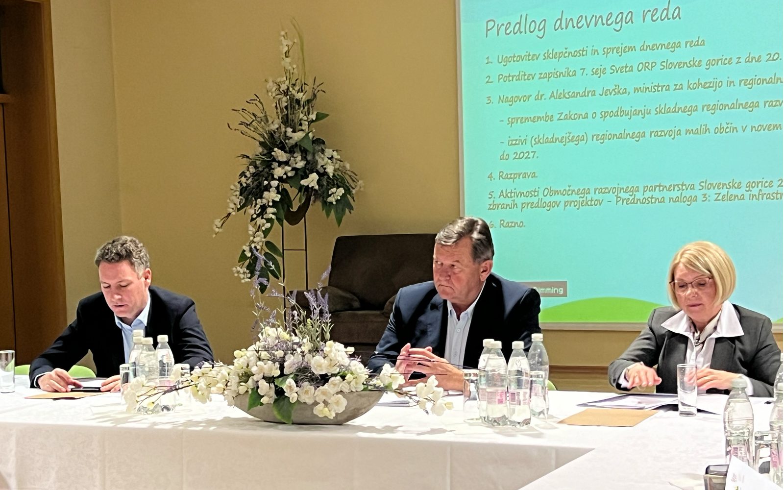 Članice in člani Sveta Območnega razvojnega partnerstva (ORP) Slovenske gorice se je v petek, 26. januarja, v Lenartu zbral na svoji 8. seji, ki se je je na povabilo udeležil tudi dr. Aleksander Jevšek, minister za kohezijo in regionalni razvoj. Slednji je zbranim predstavil spremembe Zakona o spodbujanju skladnega regionalnega razvoja, govora pa je bilo tudi o izzivih (skladnejšega) regionalnega razvoja malih občin v novem programskem obdobju do leta 2027.