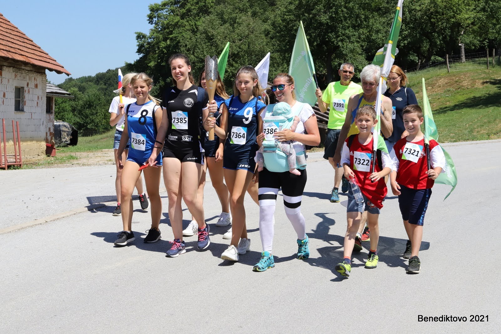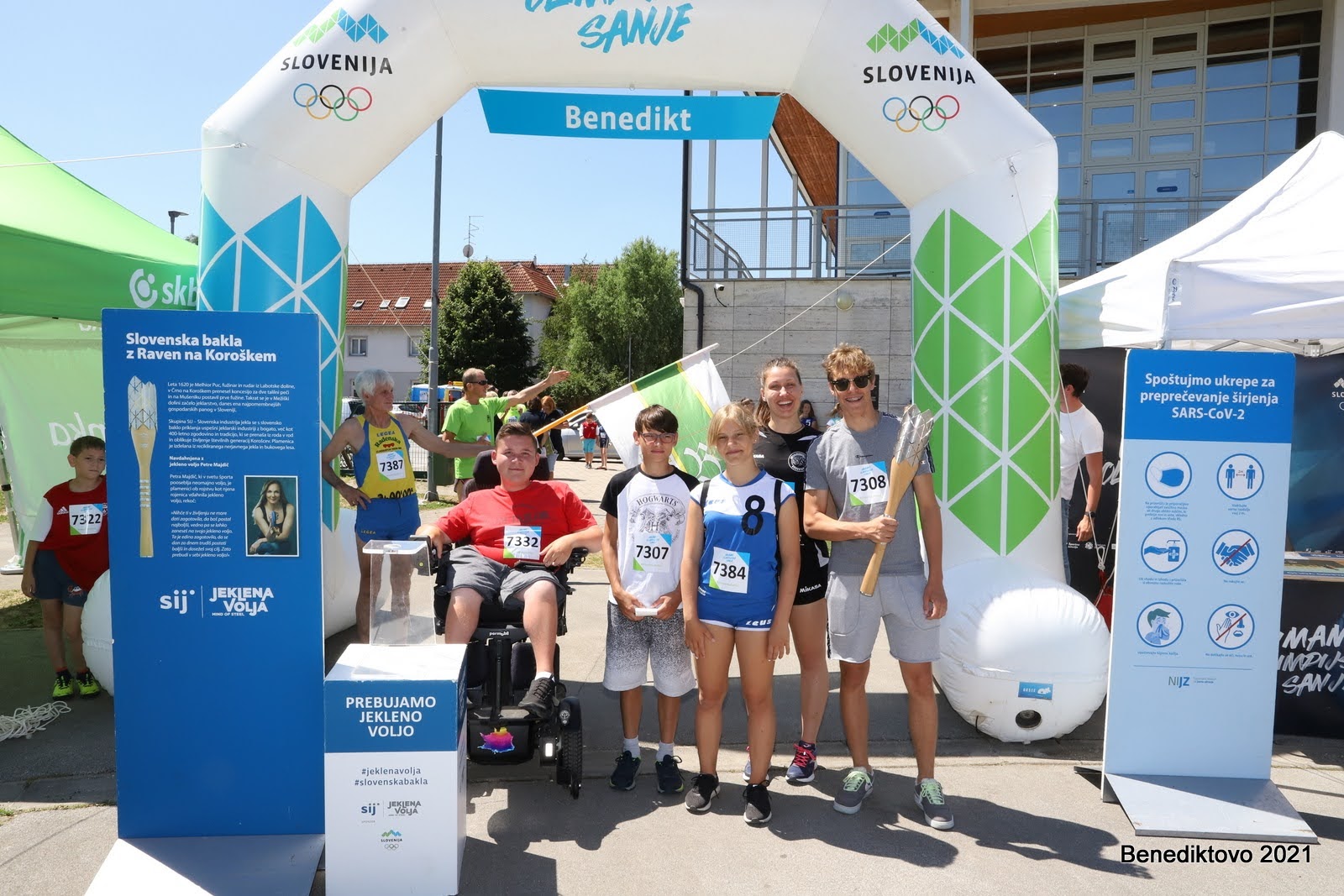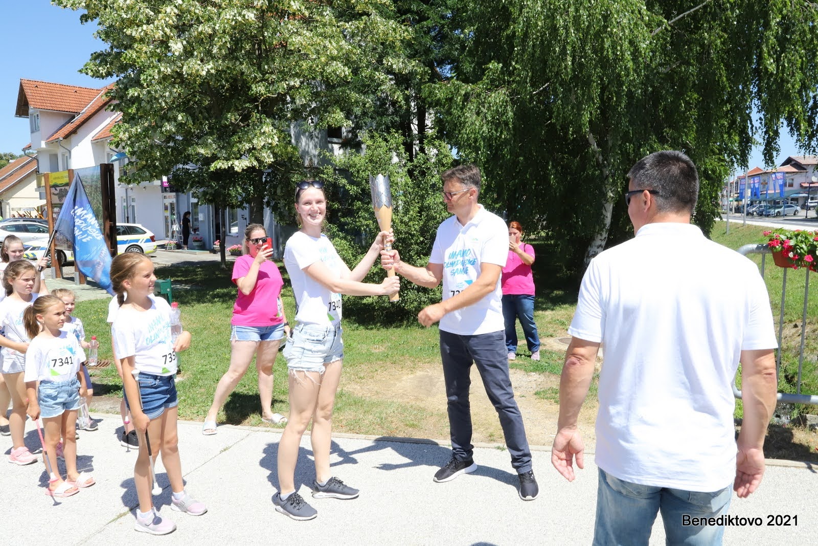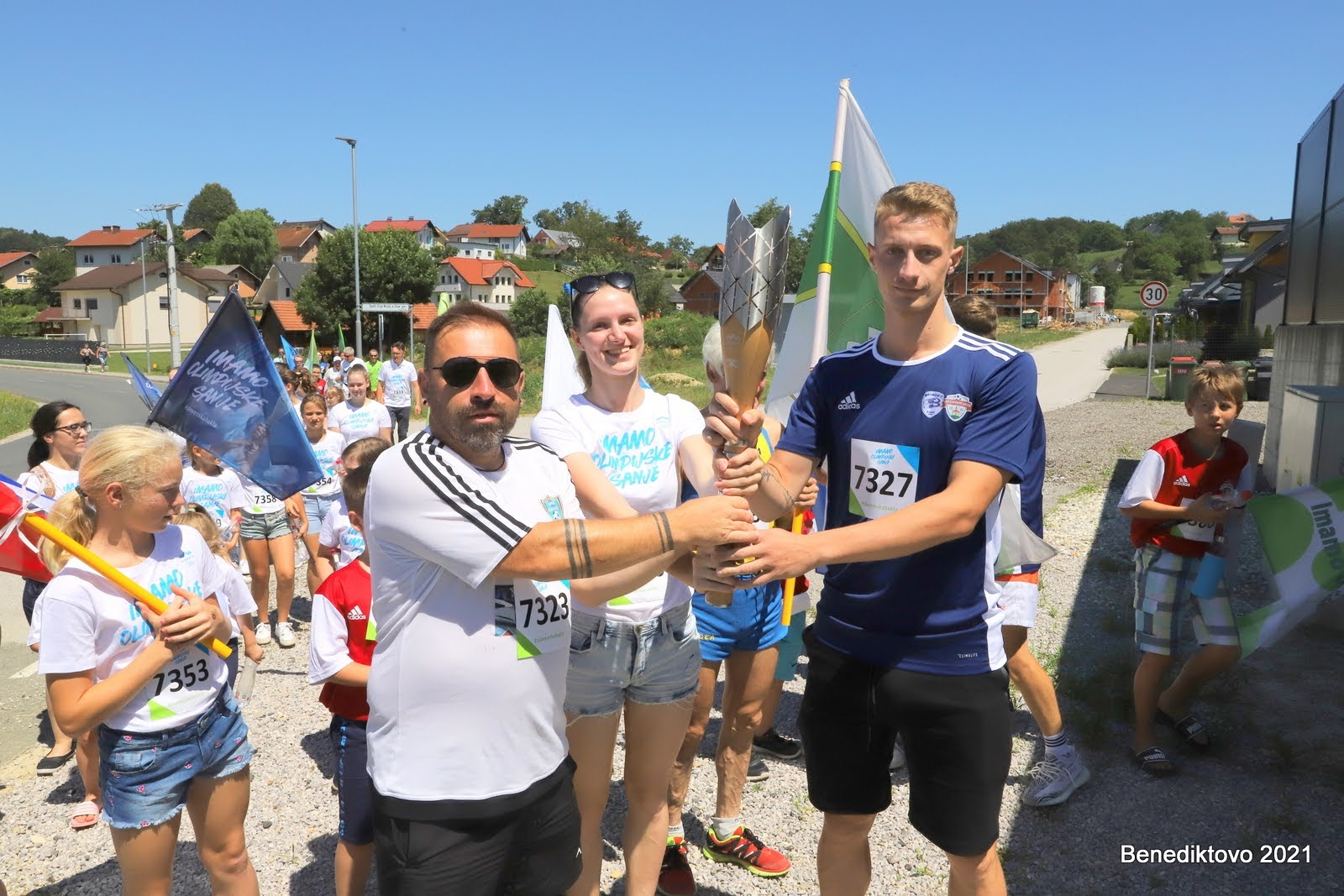Še dobro, da naslednja postaja – Benedikt ni daleč, bi lahko dejali za poln želodec. Tam so Slovensko baklo na igrišču pred športno dvorano znova pričakale mažoretke z ubrano koračnico. Zbrane je nagovoril župan Milan Repič ter prvi podpredsednik OKS-ZŠZ mag. Janez Sodržnik. Na krožno pot so se kot prve podale članice Mažoretnega in twirling kluba Benedikt. Ognjeno štafeto so pred gotskim biserom – cerkvijo Svetih Treh Kraljev v Slovenskih goricah prevzeli mladi upi iz Kluba malega nogometa nato so za plamenico poskrbeli člani Odbojkarskega kluba, čast zadnjih pa je pripadla Društvu upokojencev Benedikt, ki so ognjeno štafeto prinesli na igrišče, kjer se je krog tudi sklenil.
