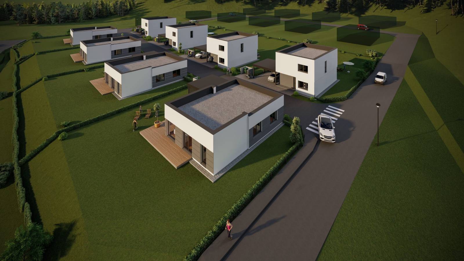 Sprva sta razmišljala o klasičnih dvokapnicah, a je nato padla odločitev za hiše z ravnimi strehami, po katerih danes povprašuje velika večina kupcev, zlasti mlajših.