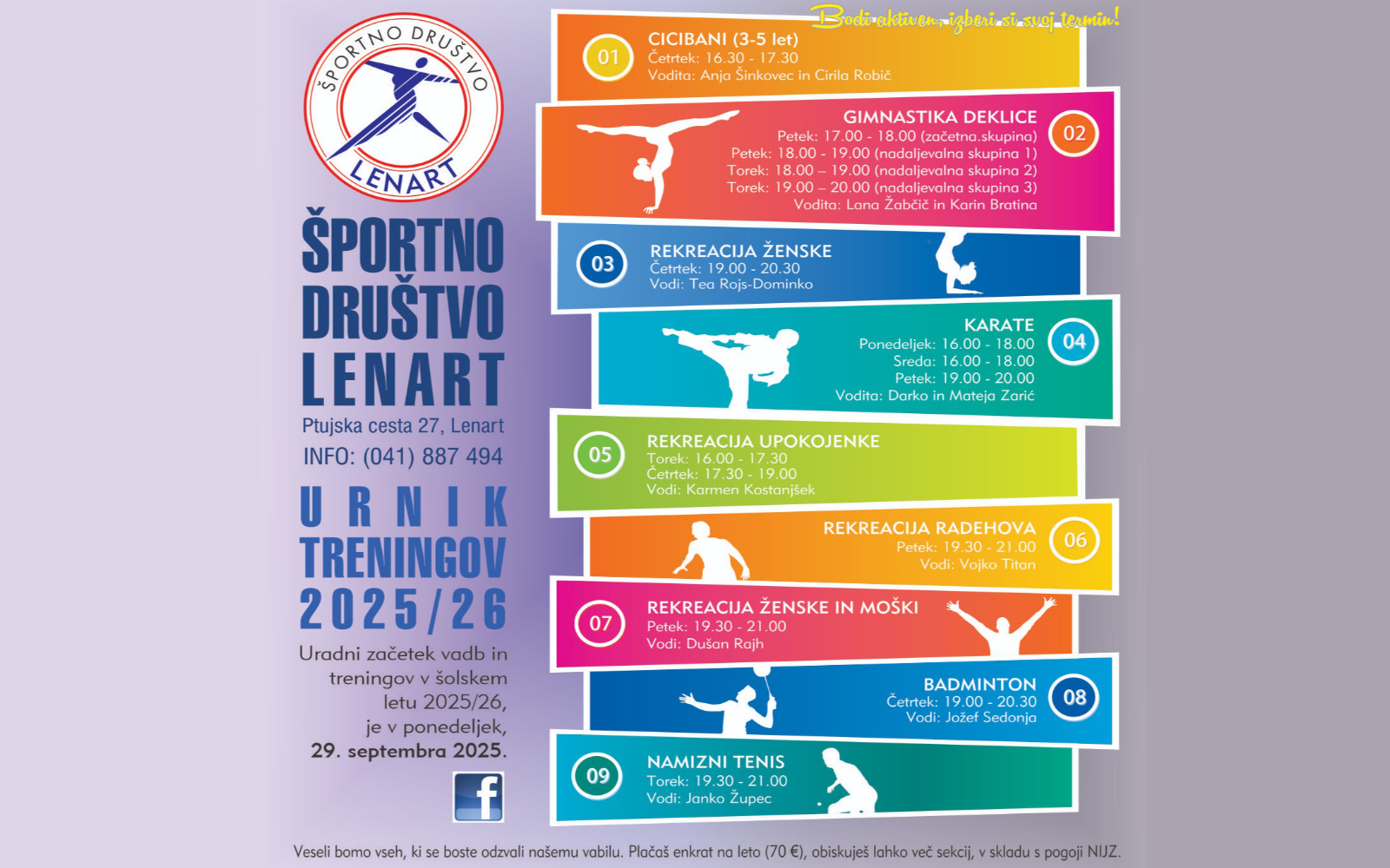 Lana Žabčič Kategorija: Lokalno Čas branja: 1 min Objavljeno: 03 oktober 2025 Vadba za vse generacije v Športnem društvu Lenart Preberite več …