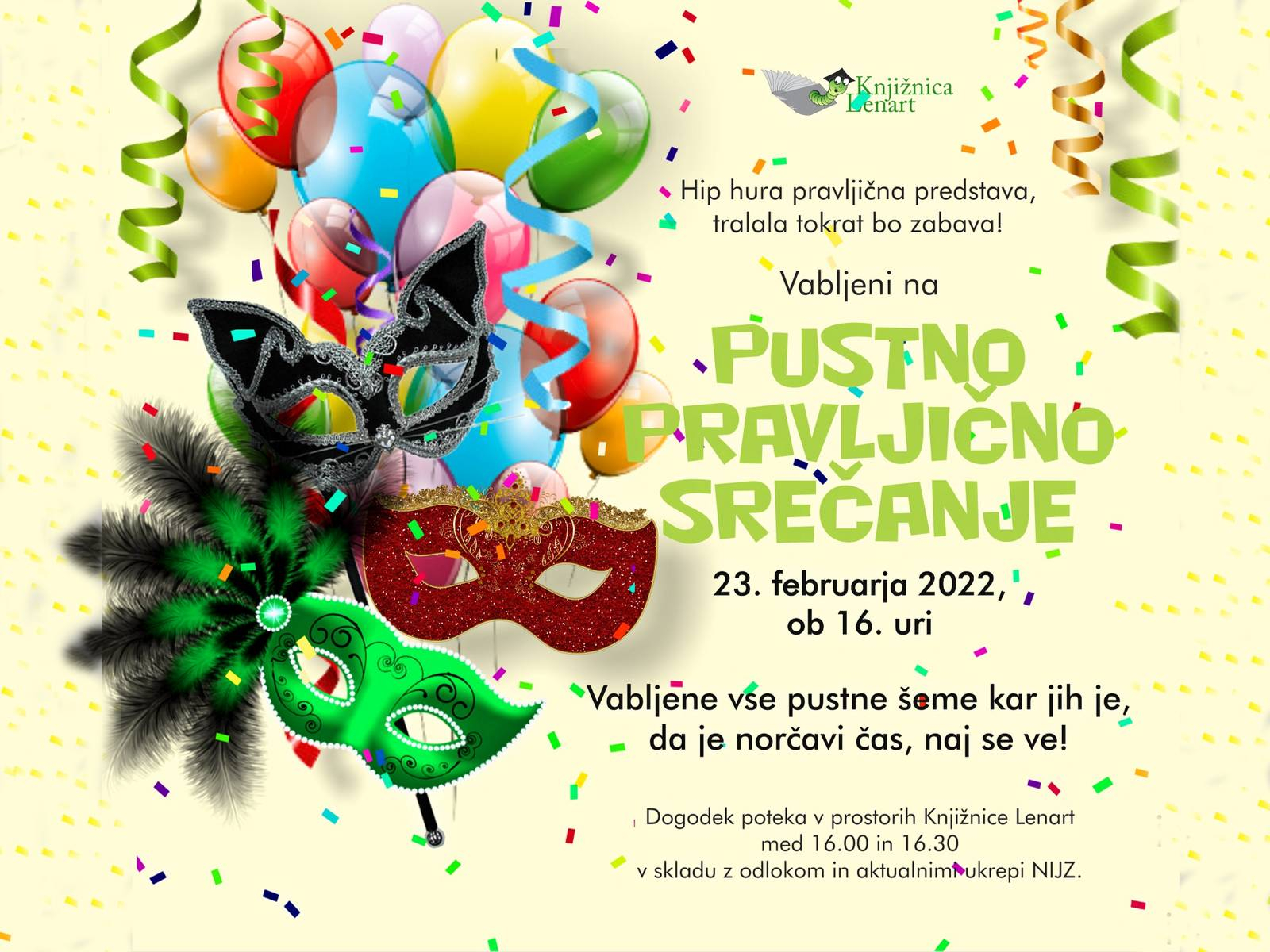 Uredništvo Kategorija: Lokalno Čas branja: 1 min Objavljeno: 22 februar 2022 Pustno pravljično srečanje v Knjižnici Lenart Preberite več …