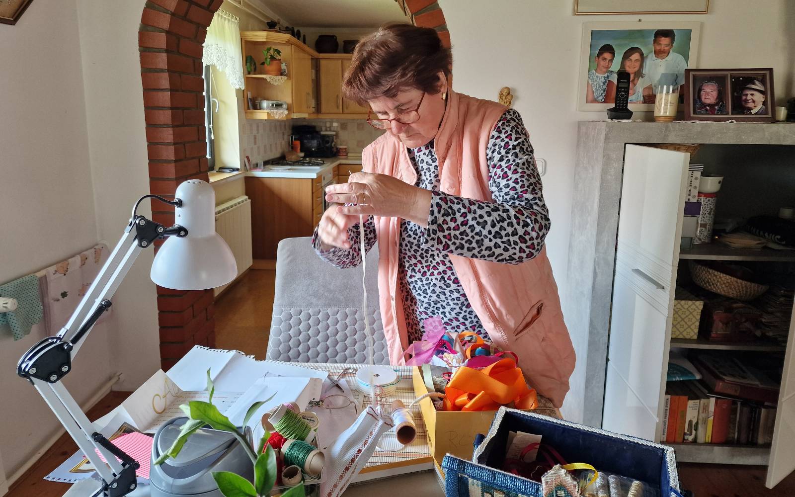 Žena Olga se vneto posveča svojemu hobiju – križkanju, obliki vezenja, pri katerem se uporablja samo križni vbod. Foto: Senka Dreu
