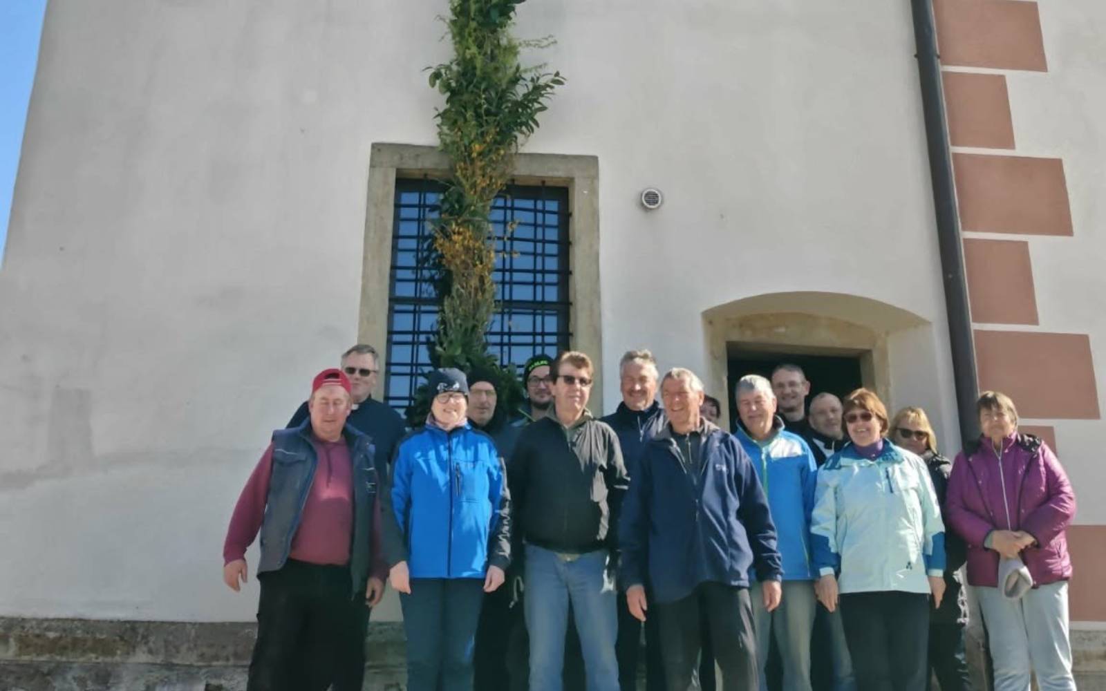 Člani TD Radehova se niso odpovedali tradiciji in so pred cerkev sv. Lenarta postavili presmec, in to kljub temu, da je tam gradbišče zaradi obnove strehe. Foto: Jurij Šuman