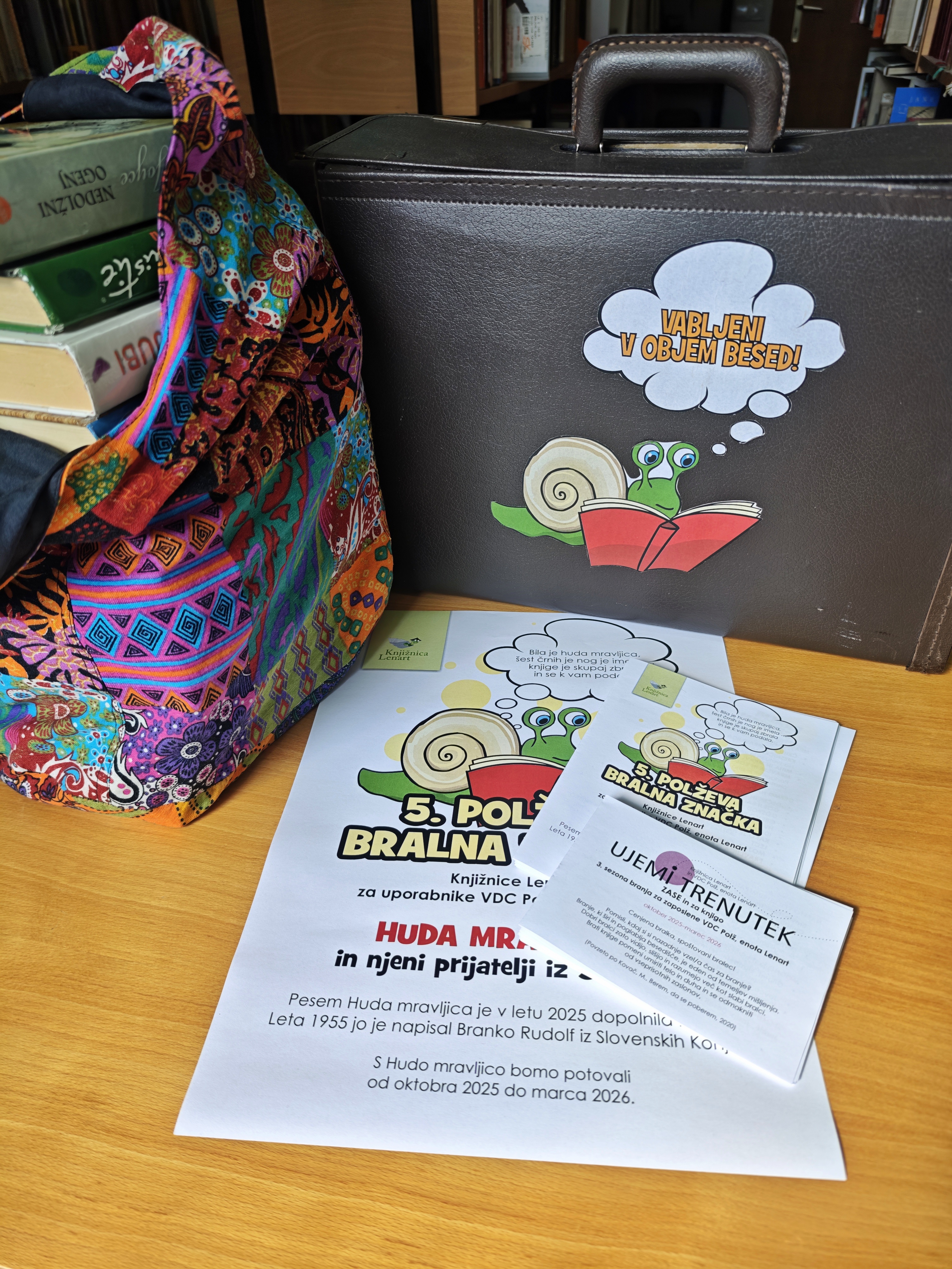 V torek, 30. septembra, so v okviru Nacionalnega meseca skupnega branja v prostorih lenarškega VDC Polž predali bralni kovček in knjižno torbo uporabnikom in zaposlenim. Bralni izbor za uporabnike so obarvali s 70. obletnico prve objave pesmi Huda mravljica ter popotovanjem po naši deželi kar v domačem zavetju.