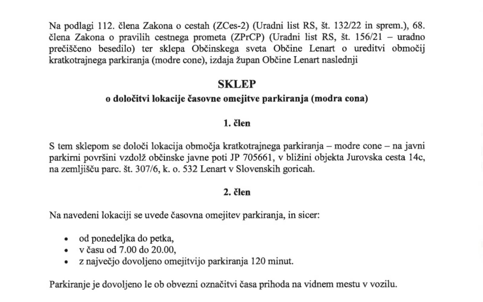 Sklep o določitvi lokacije časovne omejitve parkiranje oz. modre cone v bližini novih blokov na Jurovski cesti je župan mag. Janez Kramberger podpisal 8. aprila. Z njim je na omenjeni lokaciji uvedel časovno omejitev parkiranja, ki velja od ponedeljka do petka med 7. in 20. uro.