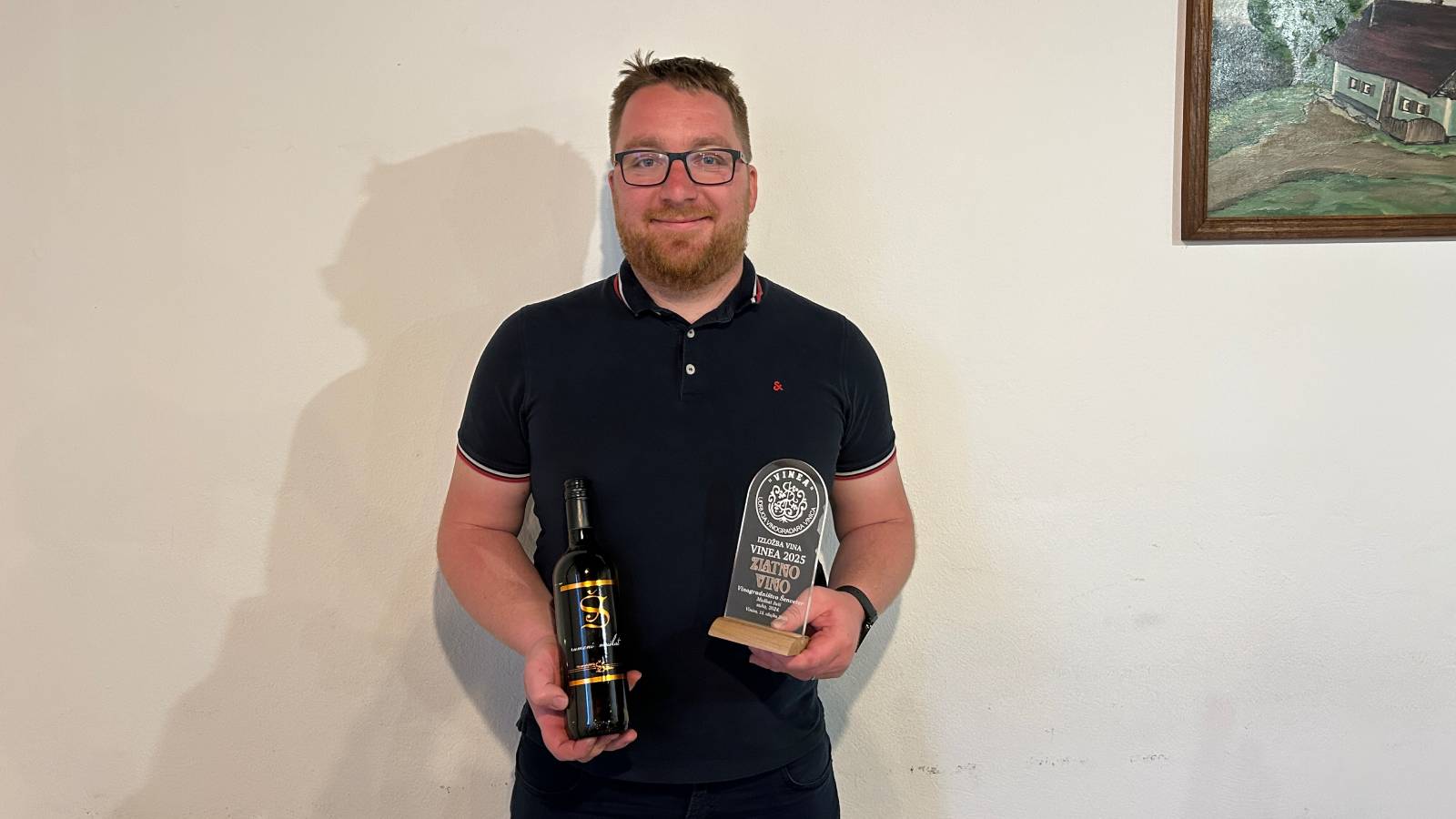 Matija Šenveter z nagrajenim vinom. Foto: Mojca Simonič