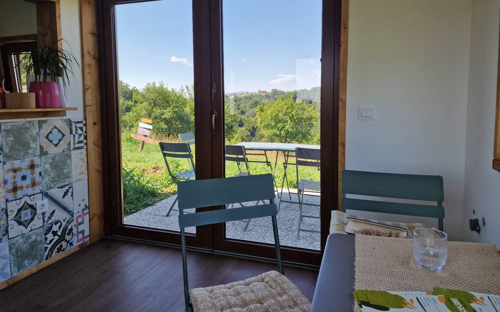 Poleg ograd za živali, ki se pred vročim soncem skrivajo v senci dreves, mi pokaže kuhinjo, v kateri že diši po veganskem kosilu: pleskavici z zeljno solato in sladici iz domačih sliv. Pelje me do templja, v katerem opravijo dnevne obrede, prostora, kjer z udeleženci izvajajo jogo, meditacijo, zavestno hojo in detoks dihanje, in slednjič do ljubke kavarnice Ahimsa, ki so jo uredili letos in iz katere se razprostira čudovit pogled na bližnje griče. V njej za zdaj dobijo vegansko kavo le udeleženci raznih tečajev in aktivnosti, ki jih organizirajo, za širšo javnost pa bo odprta takoj, ko jo bodo registrirali kot kmečki turizem.