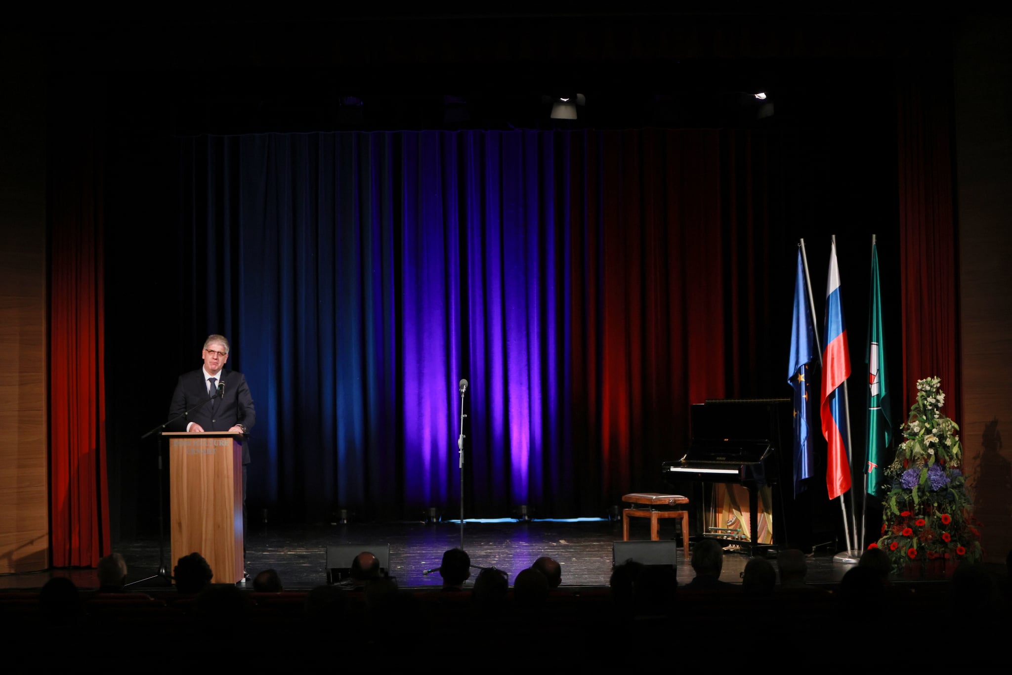 Slavnostni govornik na proslavi je bil notranji minister mag. Boštjan Poklukar. V zaokroženem nagovoru je orisal nevarnost, ki je grozila Slovencem kot narodu v času okupacije, ko so okupatorji želeli Slovence izbrisati in uničiti. Upor je bil neizbežen in niti najhujši teror in zločini okupatorjev ga niso mogli zaustaviti. Omenil je vlogo OF in opozoril, da so bili slovenski partizani iskreni domoljubi, ki so branili svoje domove in domovino. Zgodovinska resnica o tem je več kot jasna, bili so del zmagovite protihitlerjevske zavezniške koalicije in so častno pravili svojo domovinsko dolžnost, kar je vtkano v temelje zdajšnje samostojne Slovenije. Enako kot so bila dejanja generala Maistra, primorskih Tigrovcev ter nazadnje še slovenskih teritorialcev in pripadnikov slovenske Milice v vojni za Slovenijo 1991. Treba je spoštovati celotno zgodovino naroda in države in se zavedati dolgega procesa, ki je pripeljal do lastne demokratične in svobodne države. Zmaga zaveznikov nad silami osi je terjala strahotni davek več kot 60 milijonov žrtev. To je nepredstavljiva številka in teh žrtev se je treba vedno spominjati z velikim spoštovanjem. Predvsem pa je to večni opomin, da je treba skrbeti za mir, strpnosti in sožitje, ki ga nepredvidljive svetovne razmere že načenjajo in resno ogrožajo. Minister Poklukar tudi ni pozabil omeniti, da se je druga svetovna vojna končala na slovenskih tleh, saj so bili zadnji boji 15. maja 1945 na Poljani na Koroškem. Tam so bili poraženi tudi jugoslovanski kolaboranti, ki so se preko Slovenije umikali proti Avstriji, da bi se tam predali Angležem in so med umikom storili še zadnje zločine nad lastnim narodom.